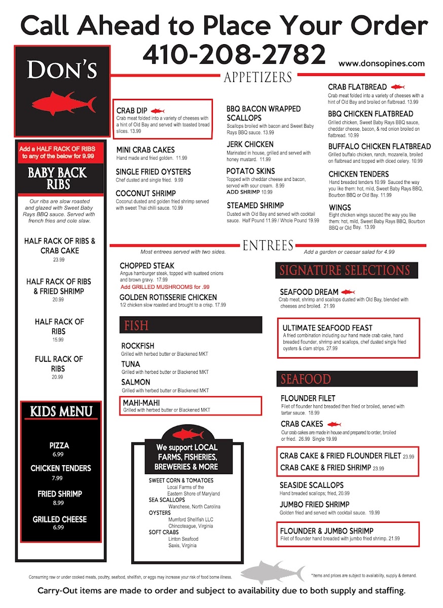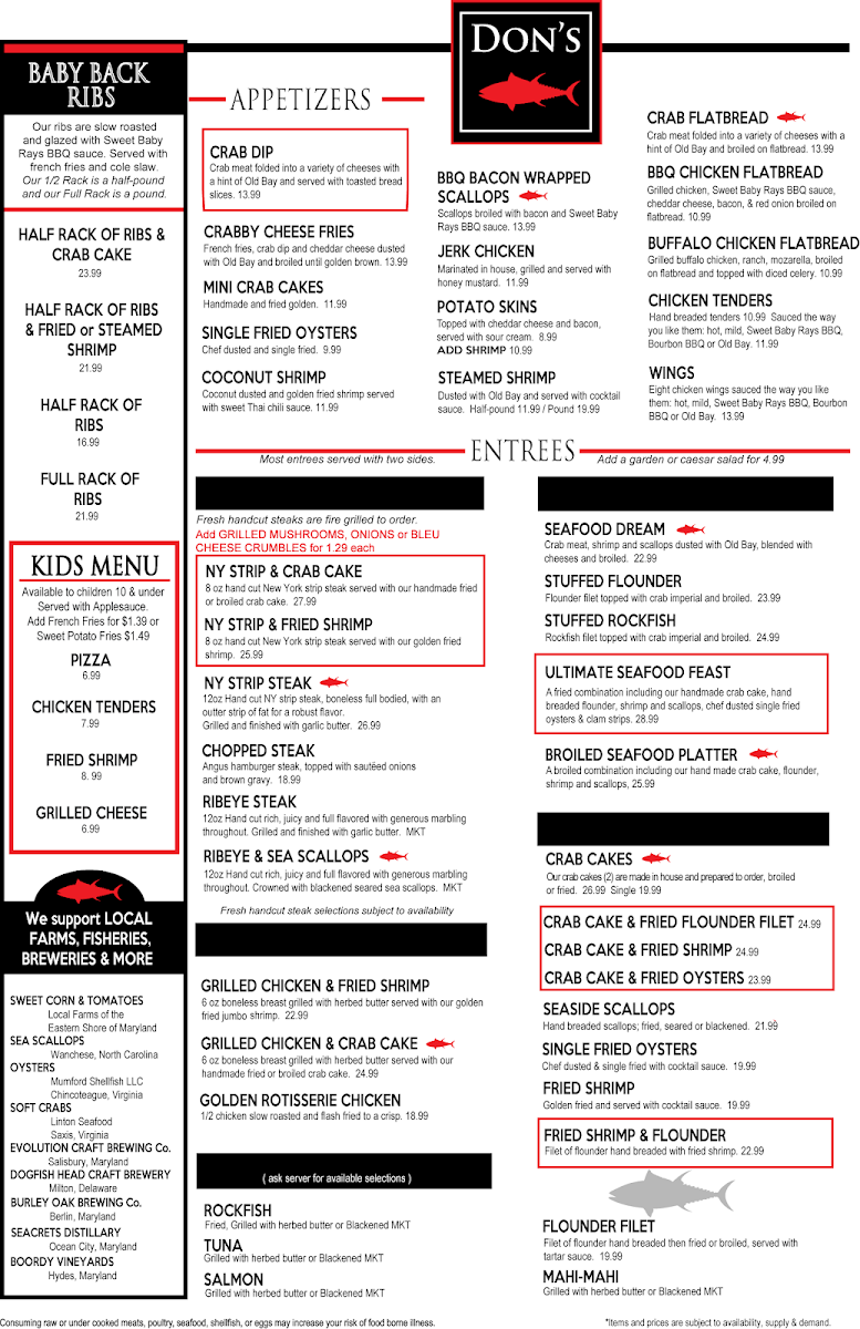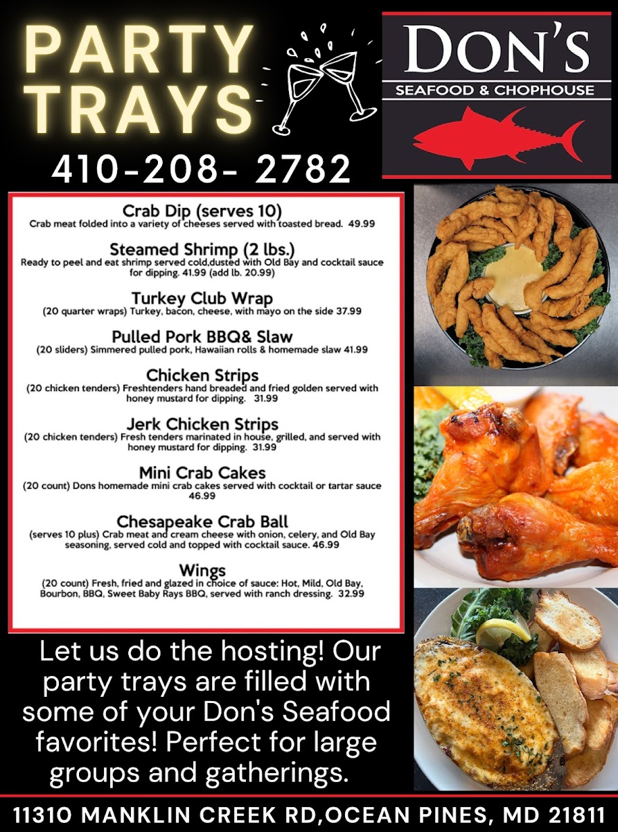 Welcome to Don's Seafood & Chophouse, a hidden gem located at 11310 Manklin Creek Rd Unit 1C, Ocean Pines, MD. This delightful eatery impresses with a menu that's a blend of the finest seafood and premium cuts of meat, serving up dishes that leave a lasting impression. Diners rave about the bacon-wrapped scallops and crabcakes, both praised for their generous portions and exquisite flavors. The shrimp tacos, accompanied by a memorable house sauce, have become a favorite, urging customers like Zarifa Lawson to crave more.